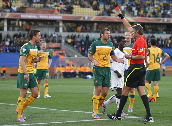 دقيقه 25: يك حركت از آيو...خيلي خوب از و بازيكن استراليا عبور مي كند...يك پاس در عرض..فرصت گلزني براي منساح.....پنالتيييييييييييييي! پنالتي براي غنا! كيول روي خط دروازه توپ را با دست بيرون مي كشد و آقاي روزتي بلافاصله با كارت قرمز او را از بازي اخراج مي كند